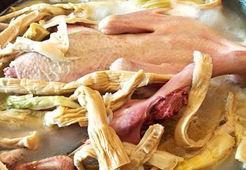 3、燉鴨:坐砂鍋,放入鴨肉,再把泡筍干的水和筍干一起倒入鍋內(nèi)。因筍干較咸,所以不用放鹽,只需加少量的料酒即可。蓋上蓋,用大火燒開,改小火燉30分鐘。即可出鍋。