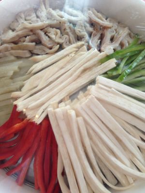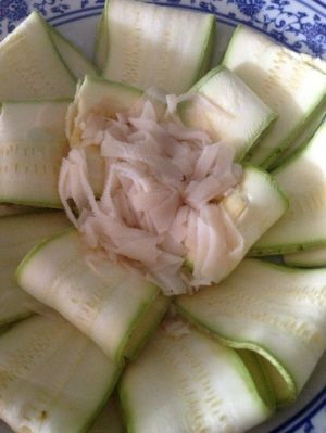 響油西葫蘆。西葫蘆切成絲,抽水,牛百葉、海蜇在水里過一遍后淋上清油,加入秘制調(diào)料,一道響油西葫蘆制成了??瓷珴桑拙G相間,清涼剔透;嘗口感,清淡爽口,脆嫩無比。更重要的是,葷素搭配,美味中又不失營養(yǎng)。