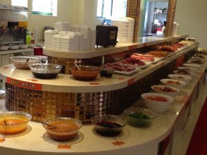 再往里走,就能看見很大一塊食料區(qū)了。有海鮮區(qū)、肉類區(qū)、蔬菜區(qū)、水果區(qū)、糕點(diǎn)區(qū)、熟菜區(qū)、冰淇淋區(qū)等。每餐擺放出來的菜品多達(dá)60余種。就拿海鮮區(qū)來說,光海鮮就有好多種可供自選,有秋刀魚、小黃魚、蝦、蛤蜊、田螺、倉鳊魚、馬面魚等等,同時(shí)還會(huì)根據(jù)時(shí)令海鮮適時(shí)調(diào)整。與其他一些自助烤肉店不同的是,顧客除了能享受可樂、雪碧、啤酒等免費(fèi)飲料暢飲外,還能嘗到尚品宮自制的飲料,比如葡萄汁、橙汁、藍(lán)莓汁、原味奶茶等,也都是免費(fèi)的哦。此外,晚餐時(shí)還會(huì)新增自制雞尾酒和奶茶布丁。